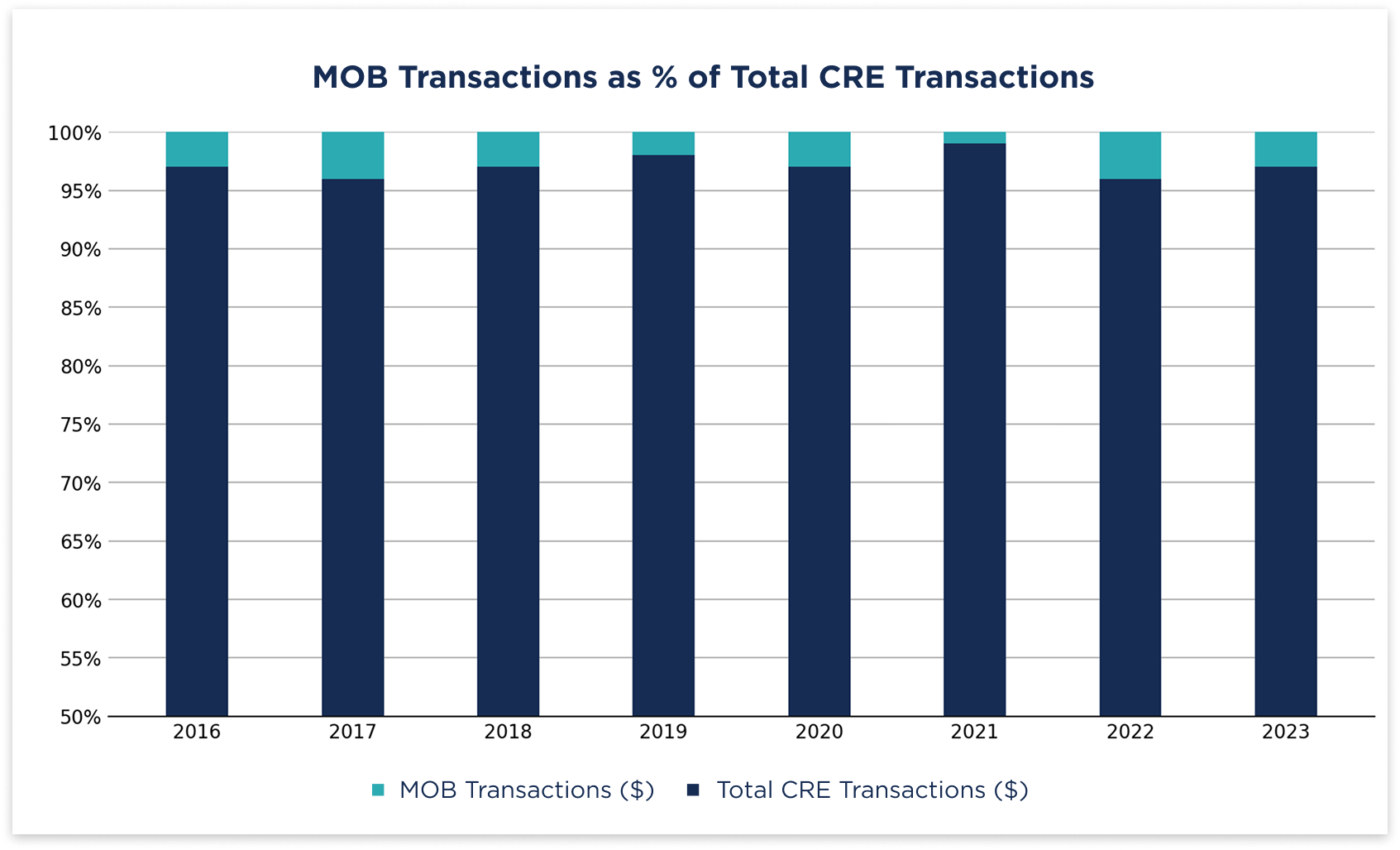 MOBs represent a small segment of the overall CRE market. And while the MOB market has unique characteristics that differentiate it from other property types, it is not immune from the challenges faced by the broader market. But as the demand for outpatient healthcare services continues to grow, our expectation is that the MOB sector will grow as well, creating opportunities for investment. Furthermore, as the MOB sector continues to attract new investors and capital, the possibility for MOB cap rates to benefit is enhanced as new entrants to the market compete for investment opportunities in the relatively small but growing sector.
