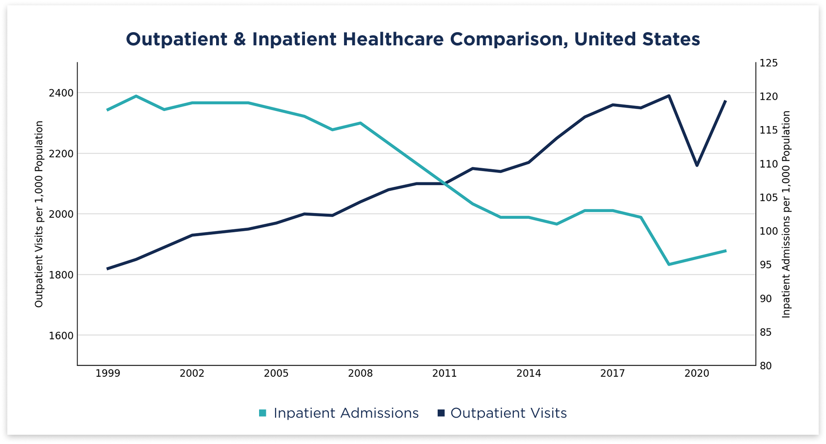 Kaiser Family Foundation. Hospital Outpatient Visits per 1,000 Population by Ownership Type; Hospital Admissions per 1,000 Population by Ownership Type. Report data source: 1999 - 2021 American Hospital Association Annual Survey.