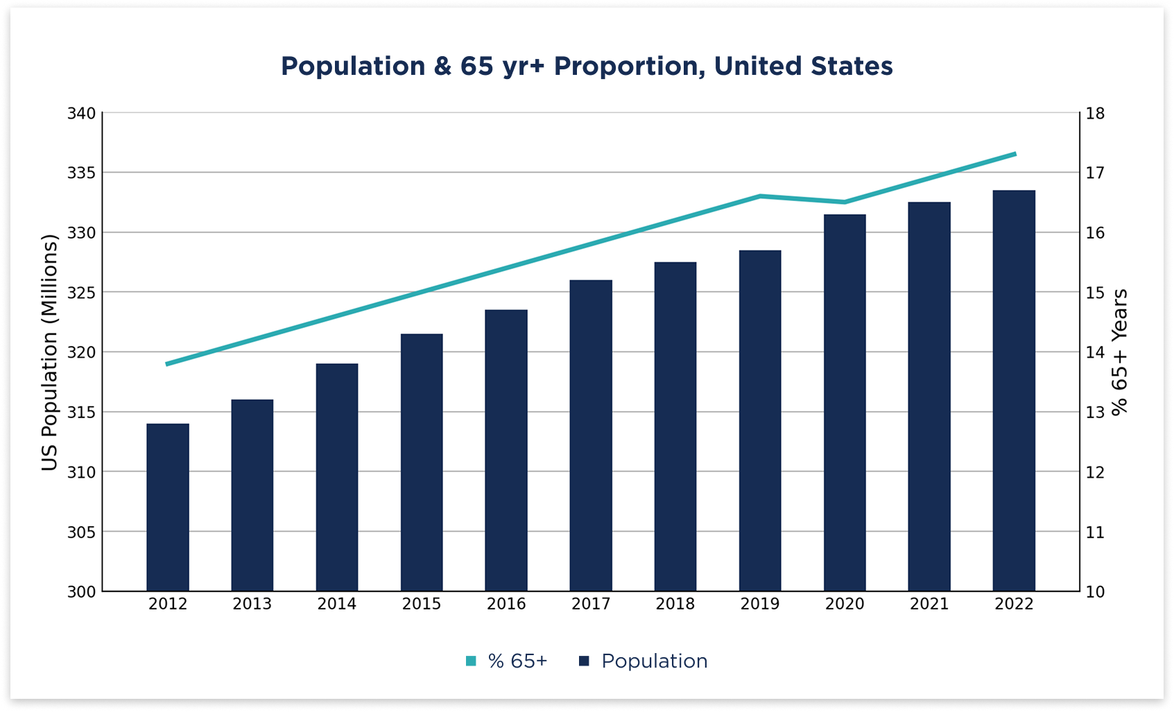 As the US population grows, the demand for healthcare services increases in parallel. In addition to an increasing population, the percentage of the US population that is older than 65 continues to increase, further bolstering demand for healthcare services.