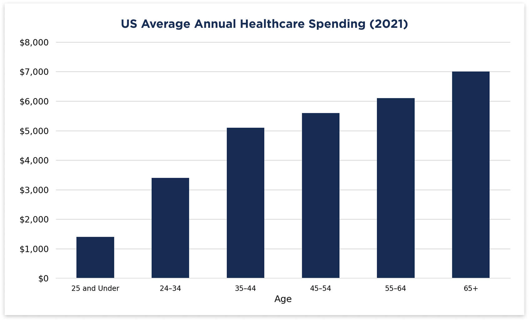 As individuals age, health care spending increases. Individuals in the United States older than 65 spend significantly more on healthcare services.