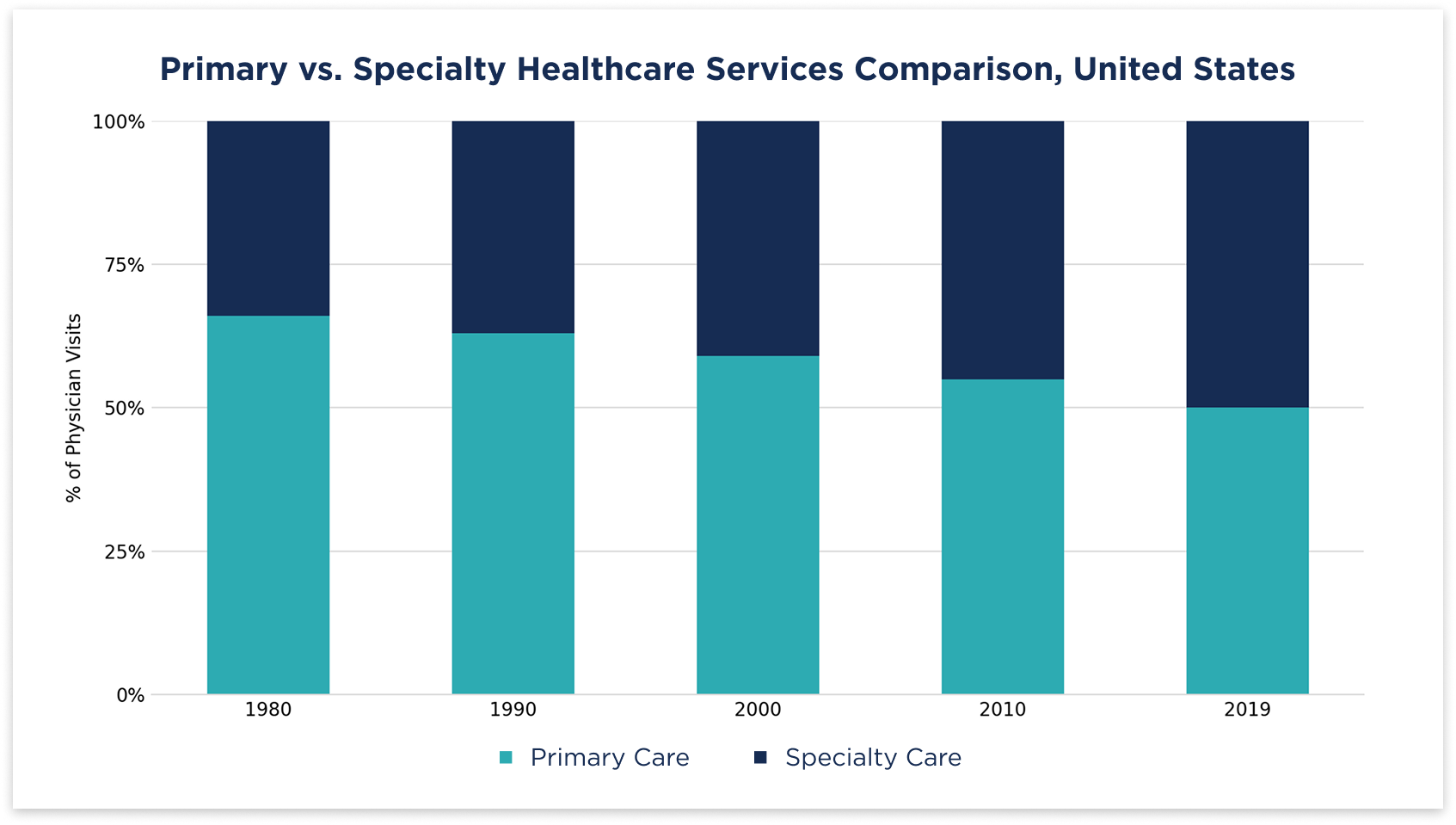 Since 1980, the proportion of patient visits to specialty physicians has consistently grown, with 50% of all physician visits made to specialty care providers in 2019 versus only 34% in 1980. Specialty care physicians often seek purpose-built medical outpatient buildings and other healthcare real estate that provide the custom, state-of-the-art facilities necessary to deliver their services and meet patient expectations.