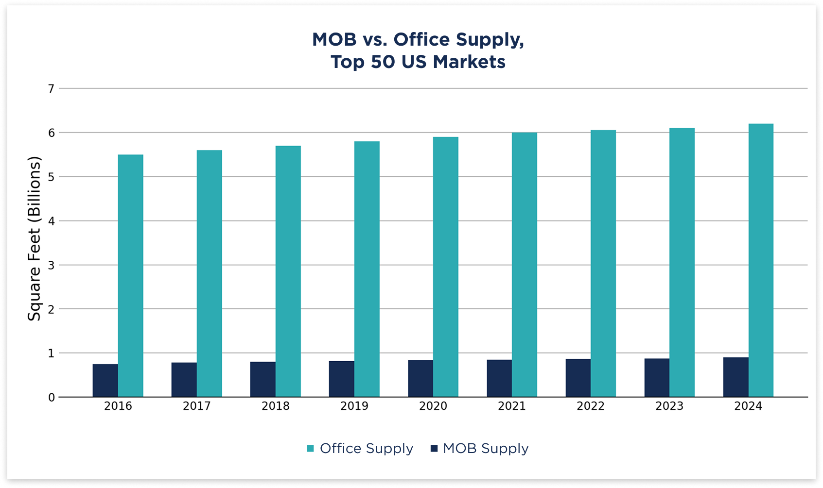 An analysis of the top 50 US markets shows that the total square footage of MOBs is approximately 14% of the square footage of traditional office buildings. While MOBs are similar in many respects to traditional office buildings, not all office buildings can be MOBs because building configuration, location, mechanical systems, and size may not be suitable for the optimal delivery of healthcare services. In any event, this supply comparison highlights the niche nature of MOBs.