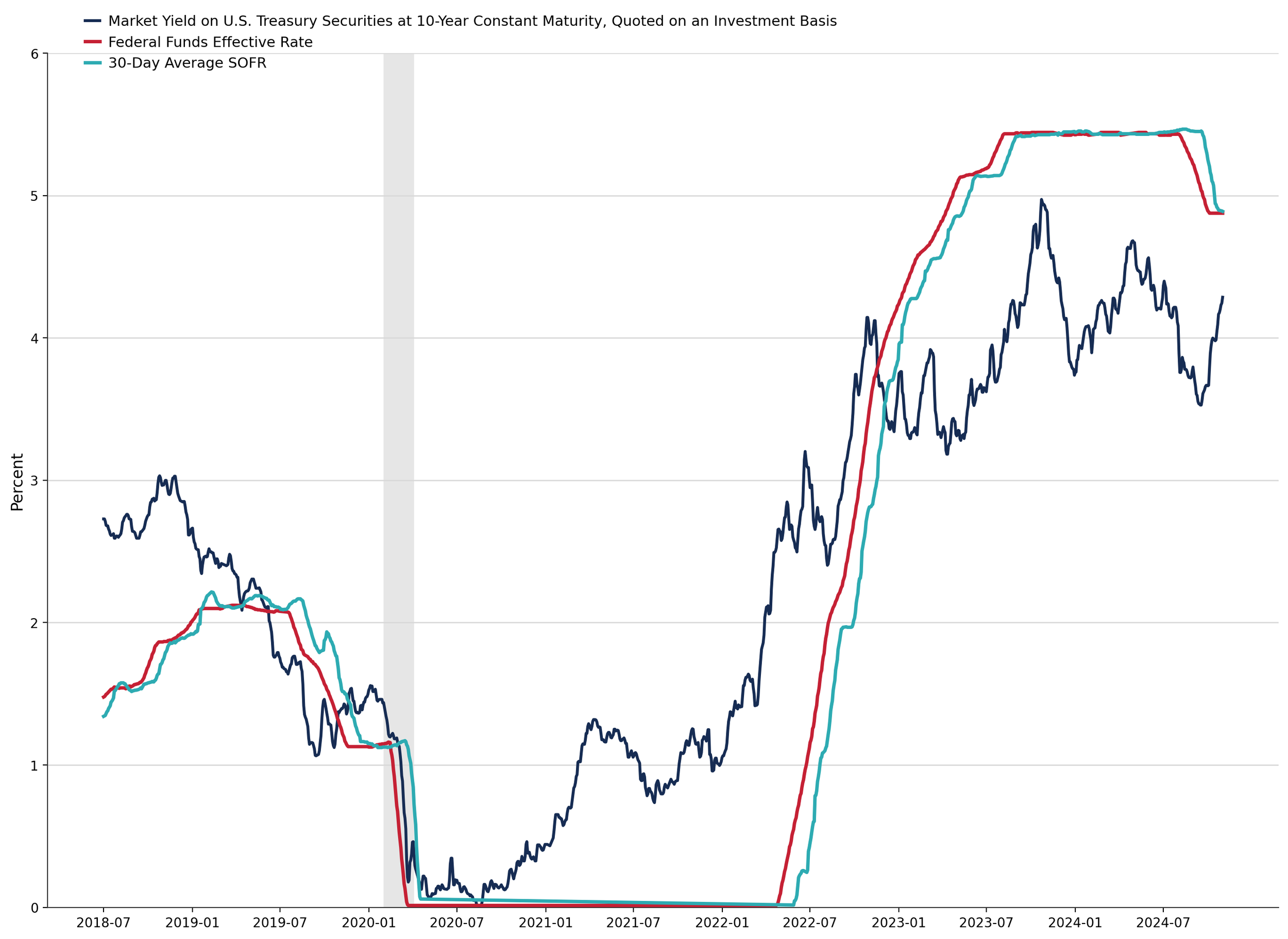 The sharp rise in interest rates between 2020 and 2022 resulted primarily from the Federal Reserve’s efforts to fight inflation. At the beginning of and during the COVID pandemic, monetary policy was very accommodative to support the economy. Economic stimulus was also provided through fiscal policy. The combination of this stimulus and supply chain disruptions tied to the pandemic resulted in significant inflation that spurred the Federal Reserve to increase the Federal Funds Rate from almost 0% to 5.33%.