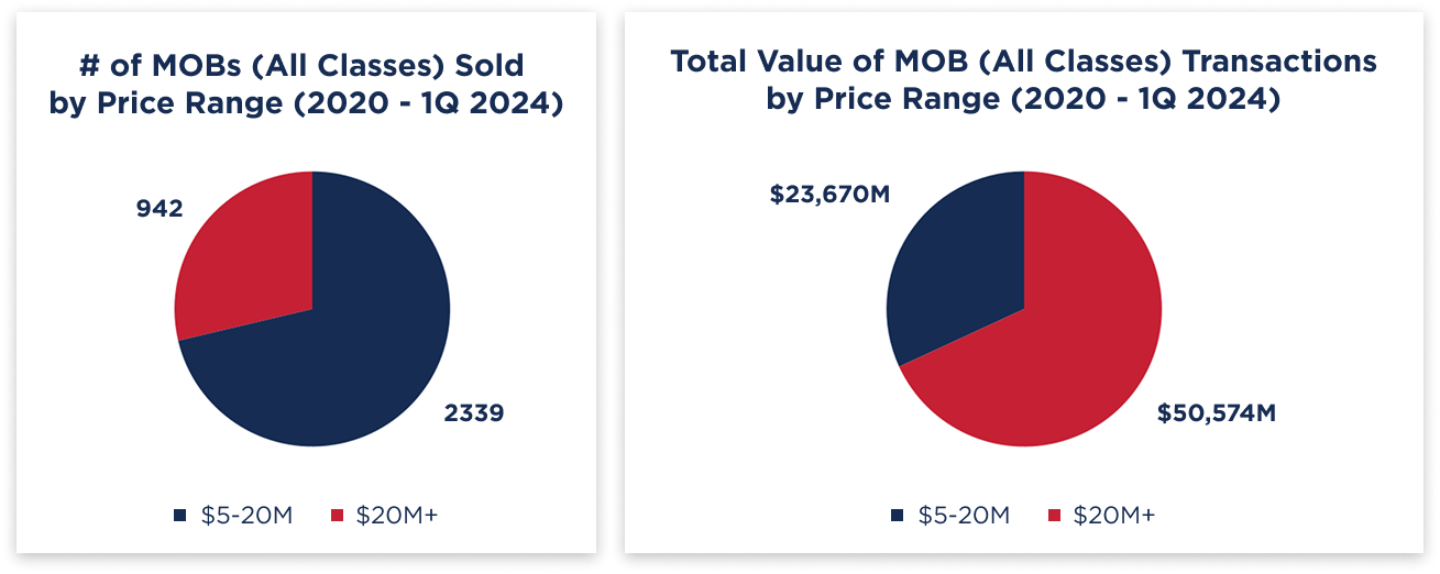 An analysis of MOB transactions since 2020 highlights the fragmented nature of the market for MOBs with a value lower than $20M. Sales of assets between $5 million and $20 million comprise approximately 70% of the total sale transactions. But assets in this value range comprise only 32% of the total sales dollar volume. This means almost 70% of capital invested in the MOB sector was in assets with larger than $20 million even though there are far fewer assets in this size range